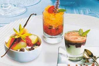 Finition et présentation : Dans un verre, verser la crème mentholée, dresser une compote de fruits rouges au poivre de Sichuan et couler le cacao léger. Décor : menthe.