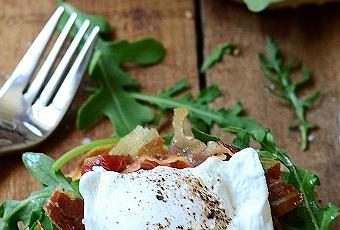 Sur la tranche de bagel, placez la roquette, le jambon, l’œuf, assaisonnez