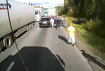 Deux petites racailles font semblant de changer une roue. Obligeamment, le routier s'arrête. Mais c'est un traquenard. Les deux olibrius le menacent et lui demandent de l'argent. Pas de chance, les routiers communiquent par radio. Ils bloquent la route et vont faire leur fête aux deux racketteurs...ainsi qu'à leur voiture.