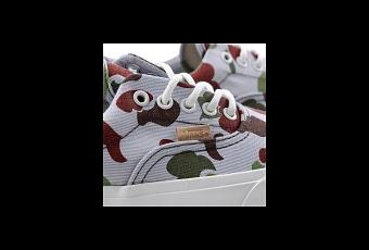 Les sneakers ont une empeigne en toile bleu rayée avec un imprimé camouflage retravaillé couleur bordeaux et vert olive, des lacets cirés, des oeillets blancs, et un heel tab en cuir.