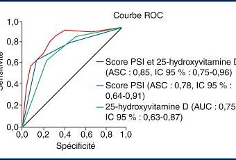 Courbe ROC (Receiver Operating Characteristic) - ou courbe sensibilité / spécificité des différentes combinaisons de facteurs prédictifs de mortalité des pneumopathies hospitalisés à 30 jours selon le score PSI (Pneumonia Severity Index) seul, le taux de vitamine D seul, et la combinaison des deux. (...). In Revue des Maladies Respiratoires Actualités Volume 4, Issue 7, December 2012, Pages 689 - 696. [pour exemple rapport pneumopathie - vitamine D] - note traducteur