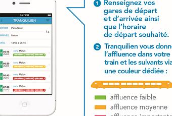Cette application permet au voyageur de connaitre à l’avance l’affluence du train qu’il souhaite prendre et d’anticiper ainsi son départ selon les prévisions. Une fois les gares de départ et d’arrivée entrées, l’utilisateur voit les prochains trains s’afficher selon un code couleur simple (vert, orange, rouge) qui correspond à la prévision d’affluence (faible, moyenne, importante). Il décide alors de décaler ou non son départ de quelques minutes, s’il le peut, si le voyant est au rouge par exemple, car le train suivant est indiqué en vert.