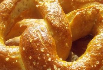 Pretzel ou Bretzel est une sorte de pain poché dans de l'eau bouilli additionné de bicarbonate de sodium et saupoudré de gros sel avant cuisson.