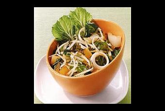 - Mettre le chou chinois dans la poêle contenant les légumes. Dresser la salade sur des assiettes et napper de sauce. Émietter les feuilles de nori et les parsemer sur la salade avant de servir.