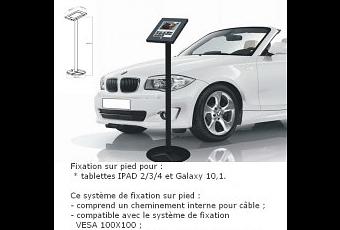 Support de communication visuelle dynamique tel que les écrans LCD avec mémoire intégrée, le support pour tablette Ipad 2/3/4 et Galaxy 10,1 est toutefois plus efficace et plus économique que ces premiers, aussi bien en matière d’investissement que d’emprise spatiale et de consommation d’énergie. En effet, les supports pour tablettes PC sont moins coûteux que les écrans LCD et présentent une envergure moins importante. Fonctionnant à priori sur batterie, les tablettes IPAD et GALAXY favorisent une faible consommation de l’énergie. De plus, grâce aux divers modèles de supports, la tablette Ipad 2/3/4 et Galaxy 10,1 s’adapte à divers usages, sur le comptoir ou dans une vitrine par exemple. Par ailleurs, la tablette Ipad 2/3/4 et Galaxy 10,1 permet de créer une publicité interactive, l’usager ayant la possibilité, selon la stratégie mise en place, d’accéder à l’écran tactile en vue de questionner l’appareil ou de défiler les contenus.