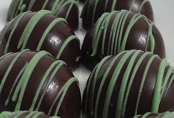 Ces coques noires striées de lignes vertes cachent une belle ganache au chocolat noir et à la menthe. Juste de qu'il faut de fraîcheur, d'amertume et de douceur pour se faire plaisir.