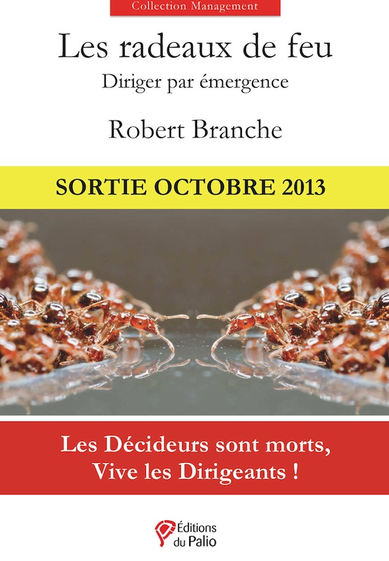 La finalisation de mon prochain livre, Les Radeaux de feu, avance. Je vais consacrer cet été à la rédaction finale.Mon blog va donc être un peu plus tôt en vacances. Dès la semaine prochaine, je commencerai à diffuser un best of au rythme d'un article le lundi et le mercredi. Le vendredi restera consacré à des billets issus de souvenirs de vacances, d'abord inédits, ce jusque vers fin juillet.Le retour en live sera pour la rentrée, probablement vers mi-septembre. Désolé donc pour cette interruption, mais qui est pour la bonne cause !En guise d'apéritif, voici ci-dessous le quatrième de couverture de ce nouveau livre :Lorsqu'un risque d'inondation les menace, les fourmis de feu s’accrochent les unes aux autres pour former un radeau vivant capable d'affronter les flots. Ce radeau est assez résistant pour surmonter les tourbillons sans sombrer. Emportées par le hasard des courants, elles finissent par accoster et, sauvées, reprennent alors leur marche en avant terrestre.Comment est née cette solution collective ? Certainement pas dans un bureau d’études ! Les fourmis savent-elles nager pour autant, et sont-elles individuellement conscientes de ce qu’elles font ? Non, la solution émerge de l’entremêlement de leurs actions individuelles.Comme les radeaux de feu, les entreprises sont des construits sociaux qui voguent sur les flots de l’incertitude. La puissance collective y est sans commune mesure avec les capacités individuelles, et les solutions naissent involontairement. L’impact des décisions de leurs dirigeants est finalement de peu de poids face à la force de ces émergences aléatoires. D’autant moins qu’à la différence des fourmis, chacun de nous construit sa propre analyse de la situation et prend les initiatives qu’il juge bonnes !Aussi le rôle majeur du dirigeant n’est-il plus tant de décider que de révéler la destination vers laquelle vogue le radeau, de responsabiliser ceux qui s’y trouvent, et de créer le climat de confiance indispensable à l’action collective. Il lui faut aussi accepter de ne pas tout comprendre, apprendre à se fier à ses intuitions et à les faire partager.Cette approche est nouvelle, et savoir ne pas décider ne s’improvise pas ! A travers de nombreux exemples, l’auteur passe en revue les principes et l’éthique utiles à l’art de « diriger par émergence ».