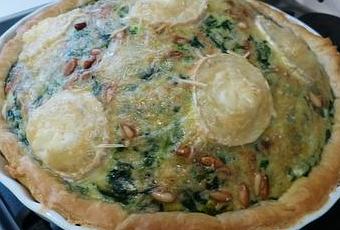 J'avais fait décongeler 5 cubes d'épinards en branches à la crème Bonduelle. Je les ai mélangés avec 4 oeufs entiers, une bonne râclée de noix de muscade, une pincée de piment d'Espelette, le tout versé dans le fond de la tarte. Ajout des pignons grillés. Ajout enfin de rondelles de bûche tendre de chèvre Président.