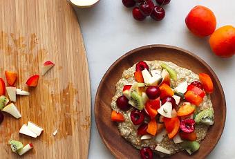 - 3 fruits de saison différents (pour moi : 1 abricot, 1 poignée de cerises, 1 kiwi)