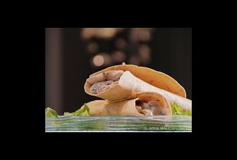 8. Prenez une tortilla bien chaude et garnissez-la avec la préparation poulet champignon et servez aussitôt avec quelques feuilles de salade (je vous conseille de prendre une batavia, une romaine ou de la sucrine).
