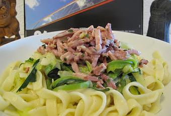 4: Servez en plaçant les pâtes en dessous, puis les courgettes et enfin les lardons à la crème ( vous pouvez rajouter du parmesan...)