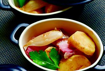 • 1 kg de Chérie (moyenne) • 300 g de poitrine fumée • 16 petites échalotes • 120 g de beurre demi-sel • 1 branche de thym
