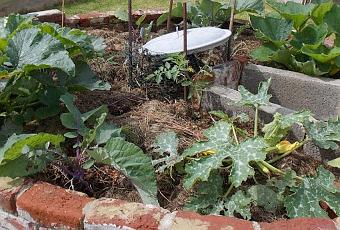 avec quelques Choux replantés (rouge et fourrager, plus du tout de choux palmier ni de brocolis), un pied de Pommes de terre (poussé tout seul), 2 pieds de Tournesols (sur une dizaine resemée), un pied de Maïs (sur une dizaine resemée), 1 pied de Poivron (sur 4 replantés), 2 pieds de Courge (sur 5 replantés), 2 pieds d'Ocas du Pérou repoussés tout seul (restes de l'année dernière)
