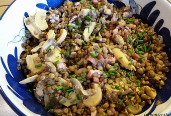 Aujourd'hui, je cuisine la salade de lentilles aux champignons et aux lardons.