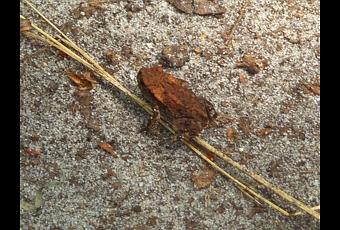 On voit quelque chose qui bouge, de la même couleur que la terre sableuse moelleuse. Je pense un peu vite à un genre de scarabée, un gros insecte pas identifié. De plus près, on découvre un crapaud de 2 cm de long.