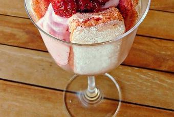 * Mettre la mousse de fraises dans une poche à douille et répartir dans chaque verre