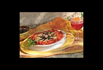 Servir le paneton d’aubergine entouré de tomate et parsemé de basilic haché, se consomme tiède ou froid.