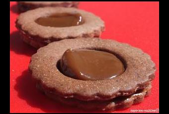 Après cuisson, disposez sur l'un des biscuits une cuillère à café de confiture de lait puis refermez avec un second biscuit troué.