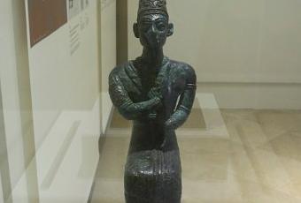 La deuxième statuette représente un homme qui porte un long manteau et une haute coiffure ovoïde. C’est la représentation traditionnelle des rois amorites de l’âge du bronze moyen, entre 1750 et 1600 avant JC. La position des mains montre qu’il portait peut être un sceptre dans la main gauche et un petit vase dans la main droite, symbole des offrandes à faire au roi défunt.