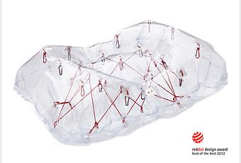 La philosophie du collectif A’postrophe est un peu particulière. Leur idée est de choisir un objet standard pour le transformer en nouvel objet, et ce de façon systématique, et avec une attention particulière sur l’environnement écologique. Nest’ est une bonne illustration de leur approcher. Il s’agit d’un projet inspiré par un poisson de verre fantôme qui devient un produit gonflable pour les loisirs. En fonction du contrôle de la structure du câble interne, Nest’ peux prendre deux formes et deux fonctions : un bateau et matelas pneumatique. Disposant d’une surface transparente comme un poisson de verre fantôme, l’intérieur est relié par des cordes rouges ponctué de 17 crochets. Nest’ est ainsi conçu pour modifier sa structure interne en fonction de la tension exercée. Quand les cordes sont accrochées aux crochets, Nest’ est un matelas pneumatique. Quand elles sont décrochées, c’est un bateau gonflable. Astucieux non ?