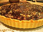 Répartir dans le fond de tarte précuit une petite (toute petite) poignée de sucre semoule, pour éviter de détremper la pâte avec la garniture, puis la verser délicatement sur la pâte. Répartir 4 bonne poignées (grosses cette fois) de noisettes concassées.