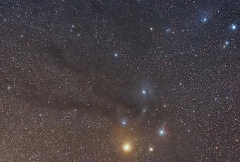 Ce n'est pas tout à fait un coeur qui saigne mais une étoile massive qui n'en finit pas de gonfler (les observations indiquent une taille 400 fois supérieure à celle du Soleil !). En refroidissant, ses couches externes se teignent en rouge. De 15 à 18 masses solaires, l'étoile est accompagnée - et oui, elle est double - une chaude étoile bleue, 370 fois moins brillante ... En temps stellaire, son explosion est imminente mais en temps humain, l'événement peut se produire d'ici quelques millénaires ... Que l'on se rassure, avec une distance estimée à environ 550 années-lumières, l'onde de choc de la supernova ne devrait pas affecter notre planète et sa fragile atmosphère. Agée de seulement 11 à 12 millions d'années, Antarès ne s'est pas beaucoup éloignée de son berceau, la nébuleuse par réflexion et émission Rho Ophiuchi dite aussi nébuleuse d'Antarès. Pratiquement indicible à l'oeil nu, le nuage moléculaire est la partie la plus lumineuse d'un vaste complexe de gaz et de poussières, particulièrement photogénique comme on peut le constater avec émerveillement sur les clichés des astronomes amateurs et professionnels. On découvre une collection d'étoffes multicolores déchirées par les vents stellaires. Des oriflammes cernent Antarès à plusieurs dizaines d'années-lumière d'un long fleuve noir, affluent providentiel de la rivière de lait, qui s'écoule dans la toison d'une matrice d'étoiles.