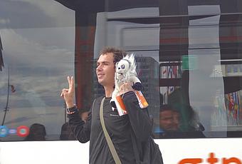 Ce touriste au sourire victorieux pose avec sa peluche mardi 2 juillet 2013 devant l’entrée du siège genevois de l’ONU. Chacun son truc. Le petit futé sur Genève à la main gauche, un V victorieux affiché sur sa seconde main, une peluche revenue de chez les morts sur l’épaule donne à ce moment solennel de la photo souvenir un air mystérieux. On peut spéculer sans fin sur cet intrus à savoir le nounours à l’aspect terrifiant, mais seul son “maître” connait la vérité. Je n’ai pas osé lui poser la question car chacun est libre de voyager avec ses souvenirs… Une citation de l’écrivain Jean-Luc Gendry s’impose: “Ce qui importe, ce n’est pas le voyage, c’est celui avec lequel on voyage”. Sans arrière pensée et sans mauvaise interprétation!