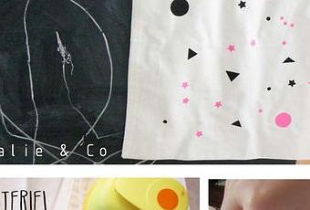 On a décidé de customiser des sacs en toile de coton avec du flex. On a choisi toutes les 2 les couleurs (du rose fluo et du noir pailleté). Pour le plus grand bonheur de la miss, on a sorti les ciseaux et les perforatrices (d'ailleurs, elles ne sont pas toutes sorties indemnes...).Ensuite, la miss a disposé les motifs sur les sacs (bon là, je suis intervenue sinon toutes les formes se seraient retrouvées au même endroit) puis j'ai dégainé mon fer à repasser pour fixer le flex. Petit mot et emballage assorti ! Un petit cadeau pour un grand MERCI !!