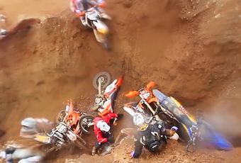 Ils vont être une petite floppée à passer à la casserole et s'empiler dans ce trou en dévers. Cette scène épique se passe à la Red Bull Hare Scramble 2013, compétition annuelle d'enduro qui a eu lieu cette année en Autriche. Elle a la réputation d'être la compétition la plus difficile du monde. On n'en doute point !