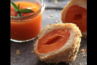 La pâte est faite à base de fromage blanc "topfen" , les quenelles sont pochées dans l'eau et ensuite roulées dans une chapelure sucrée croustillante . C'est très bon , la texture de la quenelle est agréable , pas trop sucrée et s'associe parfaitement avec le goût de l'abricot .