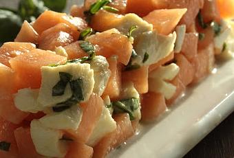 pour 4 personnes : 1 gros melon 2 boules de mozzarella di bufala 15 feuilles de basilic 1 cuillère à soupe d'huile d'olive fleur de sel