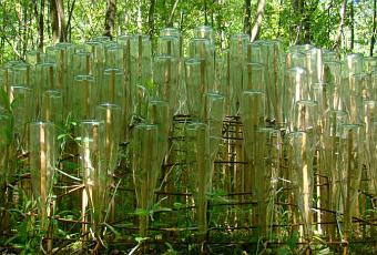 Le long d’une boucle de 1km environ, le promeneur est invité à cheminer sur un sentier où 10 œuvres révèlent ou ré-interprètent la mémoire et l’esprit du lieu : sur deux niveaux, une forêt exubérante et tapissée de mousses offre une vision contrastée et toujours renouvelée. L’enchevêtrement végétal, l’exceptionnelle couverture moussue et la qualité de la lumière filtrée renforcent la magie du lieu.