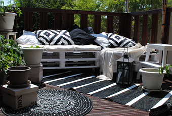 Comme vous aurez pu vous en douter, j’aime les ambiances graphiques en noir et blanc ! J’ai donc craqué sur cette tendance graphique en noir et blanc pour créer une terrasse trendy et facile à aménager…grâce à la récup’, au détournement d’objets et aux petits prix !