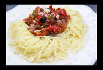 Servir les pâtes avec les poivrons et le parmesan râpé.