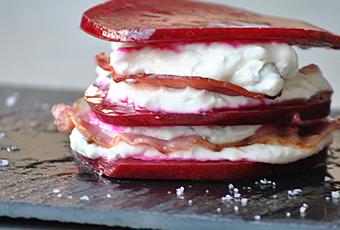 Ingrédients pour 4 personnes :1 betterave crue de taille moyenne1 chèvre frais de 200g type Petit Billy3 cuillères à soupe de crème fraiche légère épaisse4 ou 5 feuilles de menthe fraîche8 tranches de bacon4 cuillères à soupe d'huile de noix1/4 de jus citron1 cuillère à café de vinaigre de cidrepoivrefleur de selEpluchez la betterave. A l'aide d'un bon couteau ou d'une mandoline, détaillez-la en très fines rondelles dans le sens de la largeur (de manière à voir sur une rondelle toutes les lignes concentriques de la betterave - ça ne changera pas le goût de la recette mais c'est plus joli!). Il vous faut au minimum 12 rondelles de betterave, soit 3 par personne. Réservez.Réalisez la vinaigrette en mélangeant l'huile de noix, le vinaigre et le citron. Poivrez.Dans un récipient, arrosez les rondelles de betterave de vinaigrette, mélangez bien et laissez mariner un peu. Parsemez de fleur de sel.Dans un grand bol, mélangez à la fourchette le chèvre, la menthe ciselée et la crème fraîche. Poivrez.Faites griller à sec (sans matière grasse) les tranches de bacon dans une poêle.Laissez tiédir.Réalisez les millefeuilles : disposez 4 assiettes individuelles. Avec un pinceau, badigeonnez le fond de chaque assiette avec un peu de vinaigrette (prise au fond du récipient de betterave). Disposez une rondelle de betterave, une couche de chèvre frais, une tranche de bacon, encore du chèvre frais, puis une autre rondelle de betterave et ainsi de suite, chèvre, bacon, chèvre, et terminez par une troisième et dernière rondelle de betterave.Parsemez de quelques grains de fleur de sel, arrosez avec le reste de vinaigrette au fond du récipient.Réservez au frais jusqu'au moment de servir.