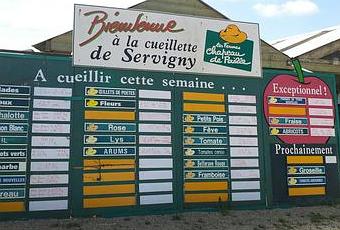 A l'entrée, un grand panneau d'accueil sur lequel figurent les produits que nous avons le droit de cueillir et leur tarif :