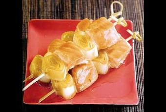 - Enfiler en alternant les dés de saumon et les tronçons de poireau sur des piques en bambou. Mélanger tous les ingrédients de la marinade. Mettre les yakitoris dans cette sauce et laisser mariner pendant 1 h au frais.