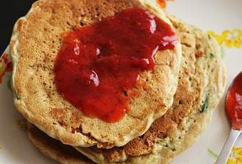 Sur la photo, j'ai servi la confiture avec des pancakes à la courgette. La même recette qu'ici (clic), en remplaçant les épices par 2 cuillerées de sirop d'érable et de la vanille en poudre. Un délice!