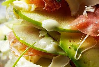 Ingrédients pour 1 personne : 50g de reblochon en tranches très fines (utilisez un économe pour le couper) – 5 ou 6 tranches très fines de pomme verte – 3ou 4 tranches très fines de speck ou d’un autre jambon sec – 2 ou 3 tranches fines d’avocat - 25g de fenouil en tranches, très fines - quelques tiges de ciboulettes - sel et poivrePour la sauce : 3càc d’huile d’olive – 2càc de crème liquide – 1càc de vinaigre balsamique blanc - sel