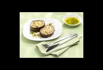 Remplir de taboulé les tranches d’aubergine, arroser d’huile aux herbes.