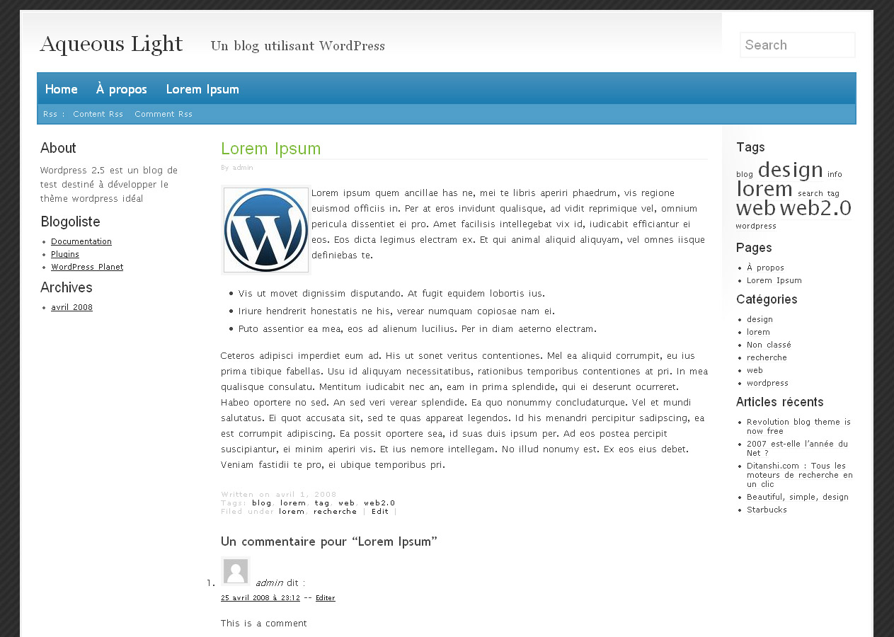 Le thème “Aqueous” avait fait l’objet d’une adaptation pour Wordpress, mais ce n’était pas le cas de la version light, enfin jusque là. Car en effet, “Aqueous Light” est maintenant disponible pour Wordpress. (sur Nioumedia)