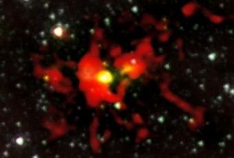 VORACE. Cette étoile en formation est une super-géante ! Le nuage à l’intérieur duquel elle est en train de se former a une masse équivalent à 500 fois celle du Soleil. À terme l’étoile devrait atteindre près de 100 masses solaires…