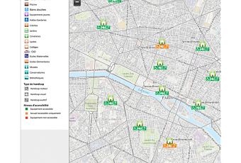 Paris, ville la plus touristique mondiale se doit de montrer son implication dans le développement à l’accessibilité. Cette carte, disponible depuis le 8 juillet dernier sur le site de la ville Paris.fr, recense les différents établissements gérés par la ville elle même ; on y trouve notamment plus de 150 écoles et plus de 80 collèges municipaux, des jardins publics, des musées, des piscines… Ont ainsi été répertoriés les endroits offrant une assistance spécifique ou un équipement permettant (même si les locaux ne sont pas accessibles dans leur globalité) aux personnes en situation de handicap de profiter des services proposés.