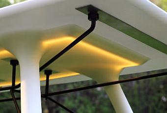 Un look futuriste pour une réalisation toute en finesse, où pour une fois le corian est traité comme un matériaux à travailler et non comme une pièce brute. Ainsi une fois travaillé, le plateau immaculé reçoit deux pieds en bois, une structure métallique garantissant la rigidité de l’ensemble et un système lumineux à LED sur batterie.