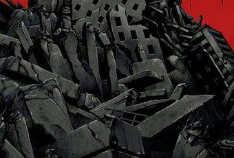 Sur celle-ci, Le monstre est représenté comme un amas d’immeubles en ruine.