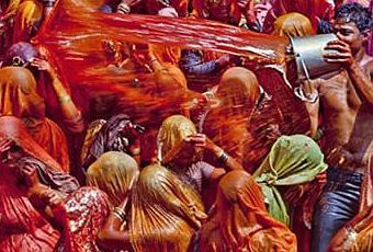 La plus exubérante des fêtes indiennes s’appelle Holi, fête de l’Amour et du Printemps. Quelle folie et quel bonheur ce fut de vouloir photographier ces foules en extase, hurlant de rire, soufflant à tue-tête dans des clairons et des sifflets, courant déchaînées en tous sens, tapant à bras raccourcis sur des tambours, des bidons ou tout ce qui pouvait provoquer un peu plus de tumulte sauvage et de joie délirante ! Car nul n’est épargné. C’est une bagarre générale, gigantesque, et en même temps une vaste rigolade. Le but de cet extraordinaire festival religieux est de faire fondre les frontières entre les individus pour fusionner avec la divinité.