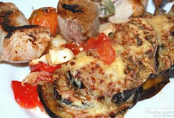 Recouvrez la surface du plat avec les rondelles d’aubergine, salez un peu, poivrez et parsemez de gruyère râpé et de parmesan.