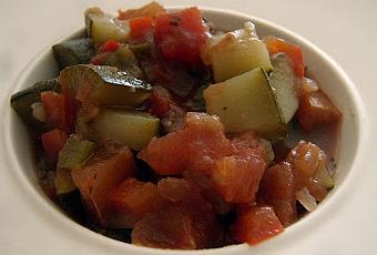 Pour 6/8 personnes : 1 aubergine, 3 courgettes, 3 tomates, 400g de tomates concassées en boite, 1 oignon, 2 gousses d'ail, 1 gros poivron vert, 1 gros poivron rouge, 6cs d'huile d'olive, sel, poivre, basilic facultatif)- Nettoyer tous les légumes. Peler et hacher l'ail, émincer finement l'oignon et couper en dés les courgettes, l'aubergine, les tomates et les poivrons