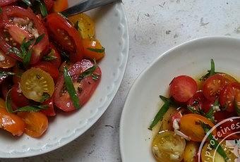 Couper les tomates en 2 dans un saladier et préparer la vinaigrette avec le reste des ingrédients