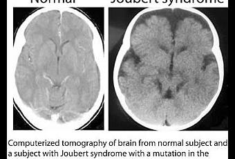 Tomographie à émission de positrons du cerveau d'un sujet normal (à gauche) versus un sujet atteint du Syndrome de Joubert (à droite).